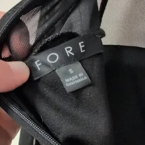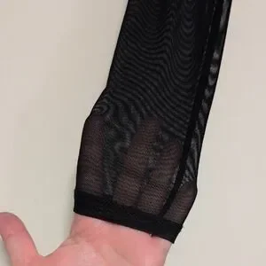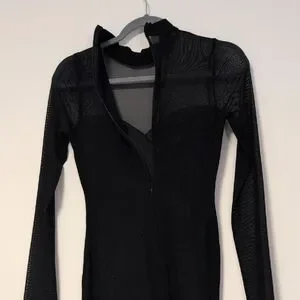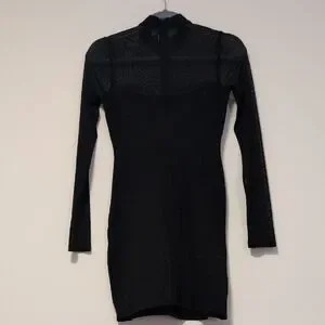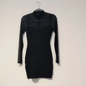 Sleek black bodycon dress with a mesh yoke and long sleeves. Designed to flatter the figure with a fitted silhouette. Subtle high neckline adds refined style. Perfect for evening events and nights out.