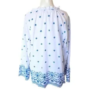 Belle by Kim Gravel Peasant Blouse Medium White Blue Floral Embroidered Boho