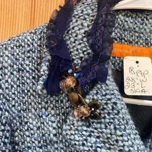 Elegant blue tweed skirt set. Features fringe details. Perfect for formal occasions.