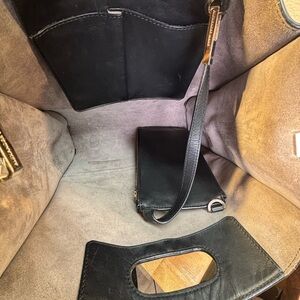 • Interior: Unlined suede interior with an attached leather zippered pouch (leashed) for valuables.