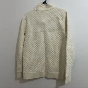 The product is a Patagonia Women's Organic Cotton Quilt Snap-T Pullover in Cream & Blue, size Large. This long sleeve sweater is made from a blend of polyester and cotton, featuring a fleece fabric type for added warmth during the winter, fall, and spring seasons. The pullover style and quilted accents make it suitable for travel and casual occasions, with a regular fit and machine washable garment care. Perfect for outdoor winter activities, this sweater combines comfort and style.