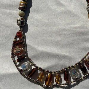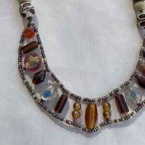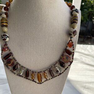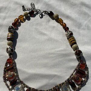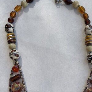 Vintage Amber & Glass Faceted Bead and Porcelain Flower Boho Necklace 21 inches
