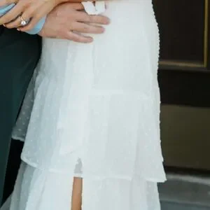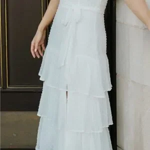 Super cute midi dress with tiered layers, swiss dot texture, side slit, ruffle straps, and self-tie waist. Wore for rehearsal dinner for wedding and loved it! Very flattering.