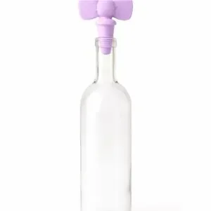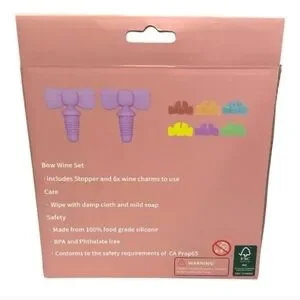 adidas bow wine stopper set. Lavender silicone bow stoppers included. Comes with six colorful wine charms. Safe food-grade silicone. Easy to clean and use.