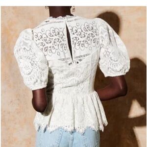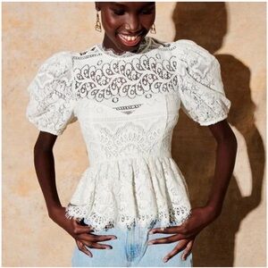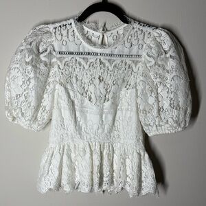 Delicate white lace blouse with a feminine peplum hem. Puff sleeves add romantic volume. High lace neckline and intricate crochet panels. Sheer lace detailing layers for a refined look.