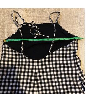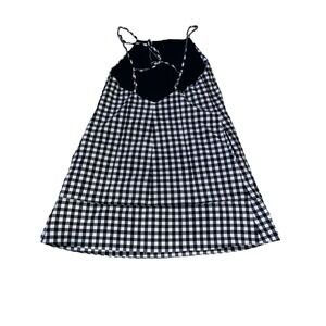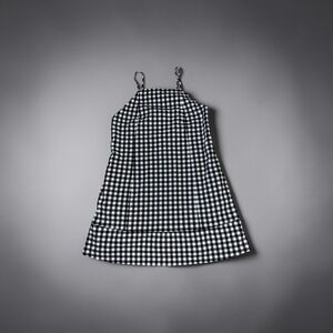 Urban Outfitters black and white gingham mini dress features a playful checkered pattern and a breezy shift silhouette. Designed with a high square neckline and delicate spaghetti straps that tie at the open back, this lightweight piece offers a casual yet chic aesthetic. Perfect for warm weather styling, the dress includes a subtly flared hemline for added movement.