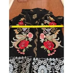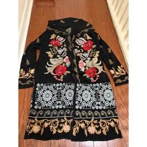 Johnny Was Black Embroidered Floral Hooded Long Cardigan Duster Sweater XS