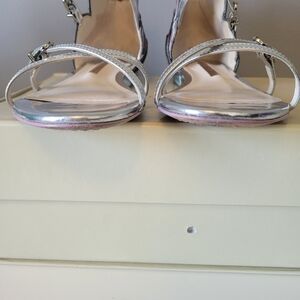 Metallic silver leather Sophia Webster Aurora Tempest Orchid sandals with multicolor 3D satin wave appliqués at counters, buckle accent at tops, covered heels and buckle closures at ankles. Includes box and dust bag.