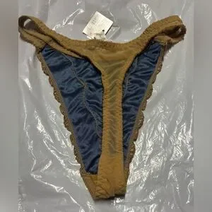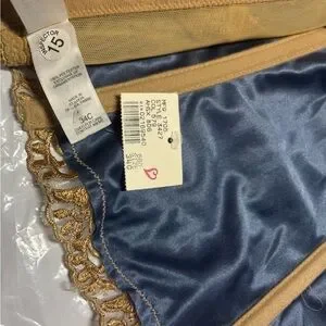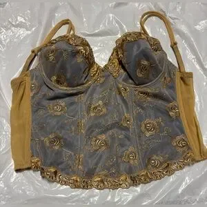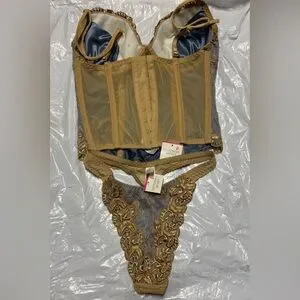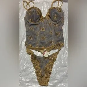 Sheer gray mesh with ornate gold lace embroidery. Underwire cups shape and lift. Adjustable gold-tone straps for a custom fit. Scalloped lace trim at hem and neckline. Feminine, luxe silhouette for special occasions. Brand new size 34 / pantie small