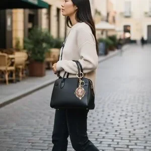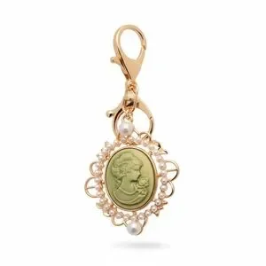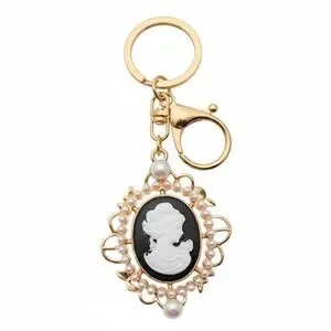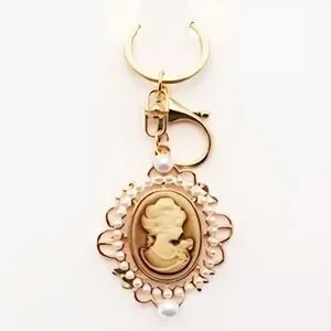 Elegant gold-tone keychain featuring a cameo charm framed with faux pearls. A refined accessory that adds vintage-inspired style to bags and keys. Lightweight and decorative for everyday use.