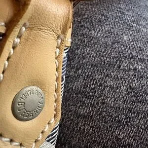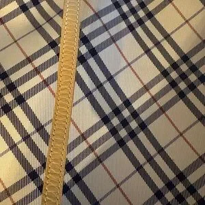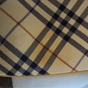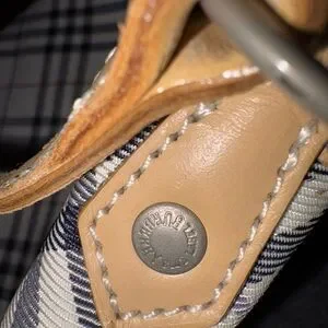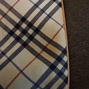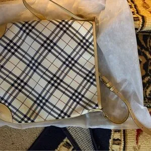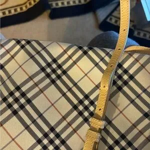 Elegant Burberry shoulder bag with iconic check pattern. Features tan and blue hues. Ideal for everyday use. The bag is beautiful. No rubs. Has slight dryness on one corner and biggest callout is alight yellow discoloration on small part of back right side if you . Cannot notice unless you are closer. Beautiful inside and straps. No smell. 12 inches x 12 inches placing this as project only d/t a yellow discoloration on corner back of purse. I did treat and got a little lighter. Discounted price for project. The leathear and inside of purse is excellent