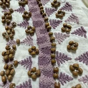 Embroidered Peasant Blouse Swiss Dot Top Cream Mauve Short Sleeve Wooden Beads from Forever That Girl, sold at Anthropologie.