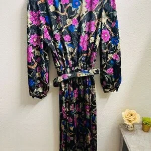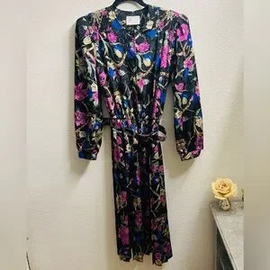 Beautiful true vintage floral dress by ORITE – an elegant and unique statement piece. Made with a rich black textured fabric and a vibrant floral print in magenta, royal blue, and gold. Features structured shoulders (shoulder pads), a button-down front, and a flowy pleated midi skirt.