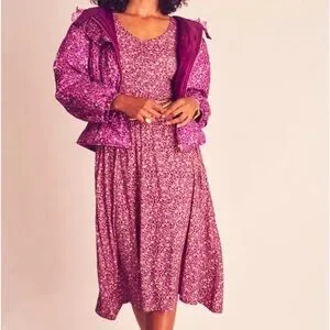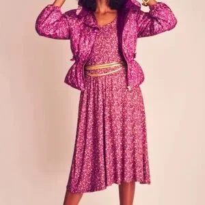 LoveShackFancy Poeta Fit and Flare Dress. Shirred bodice, fitted sleeves, hip pockets, soft stretchy fabric, pleated waist.