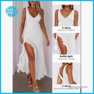 Style: Sleeveless, backless, high slit with ruffle hem