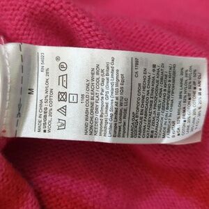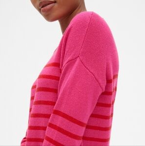 This GAP sweater features a vibrant hot pink base with horizontal burgundy stripes across the chest, offering a nautical-inspired look. The relaxed-fit pullover style with a classic crew neckline and long sleeves with ribbed-knit cuffs ensures comfort and versatility for casual wear. Made from soft, heathered wool-blend knit, this sweater is both stylish and cozy. Dropped shoulders. Side vents and high low hemline. Color Pink. Size Medium.