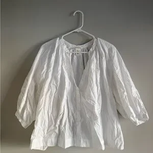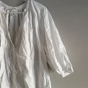 Crisp white button-front blouse from H&M. Features a loose, peasant-style silhouette. Three-quarter sleeves with a soft gathered neckline. Lightweight and airy for everyday wear.