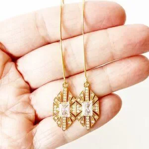 Long gold earrings with dangle. The glass crystals set into a gold plated over brass setting. These beautiful art deco earrings echo the opulence of the roaring 20's. With every glimmer, you'll be transported back to the dazzling days where exuberance and elegance reigned supreme.