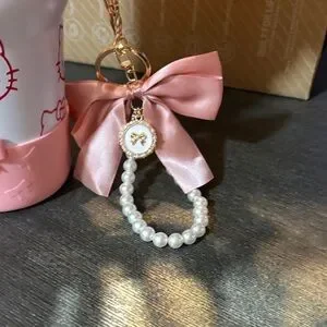 Stanley Quencher H2.0 tumbler featuring Hello Kitty pattern. White body with repeated pink Hello Kitty faces. Pink base, lid accents, and bow charm on handle. Includes decorative ribbon and pearl charm. Cute, eye-catching travel tumbler.