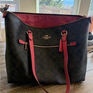 Stylish Coach tote with signature pattern. Brown body with pink accents. Ideal for daily use.