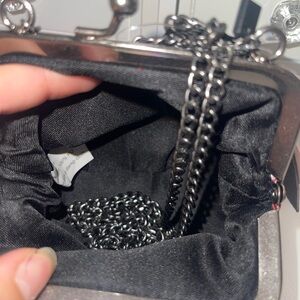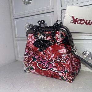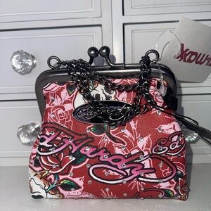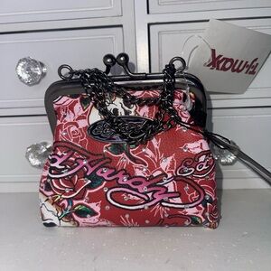 NWT Ed Hardy Floral Red Bedazzled Small bag/coin purse with Chain Bold Ed Hardy clutch featuring floral design. Accented with a stylish chain. Perfect for a statement look.