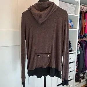 Casual plum color zip-up hooded jacket with military-inspired button detailing. Soft knit fabric for everyday comfort. Features studded pocket accents and a fitted ribbed hem and cuffs. Easy layering piece in brown for versatile wear.