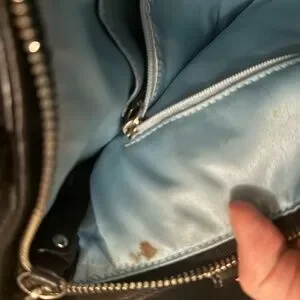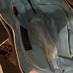 Interior: Bright blue satin lining with one zip pocket and two slip pockets.
