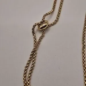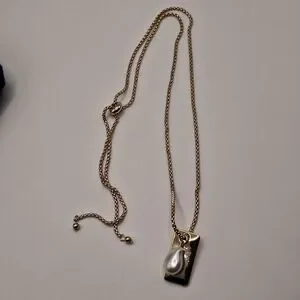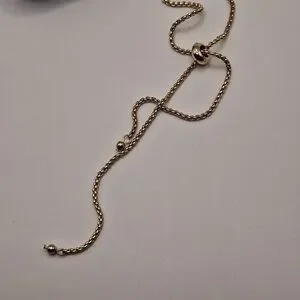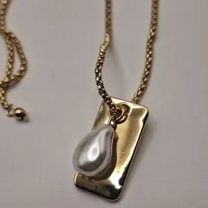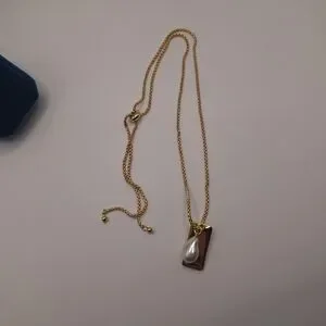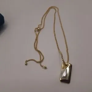 Elegant gold-tone necklace featuring an adjustable slider chain and a modern bar pendant accented with a pearl drop. Perfect for layering or wearing alone for a minimalist look.