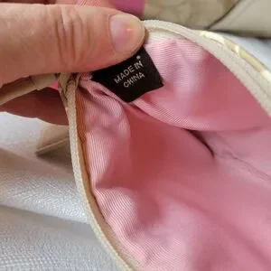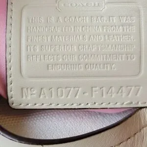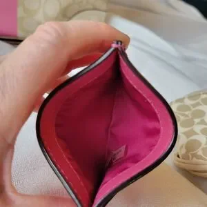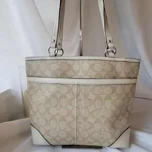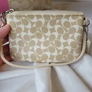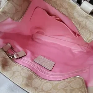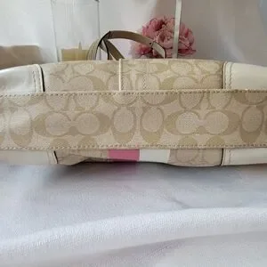 Coach tote and coordinating wristlet in beige signature coated canvas with a central pink and white stripe. Features Coach branding and leather trim for a polished look. Perfect for everyday use and easy organization. Includes a pink card case for added convenience. Branded Coach dustbag included.
