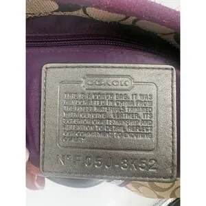 Keywords: Coach bag, monogram tote, purple suede, designer handbag, canvas tote, signature print, silver hardware, fashion accessory, everyday bag, luxury tote, chic handbag