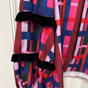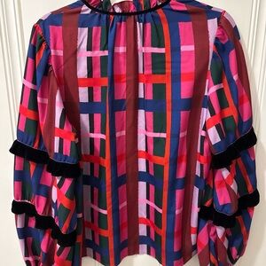 Vibrant plaid blouse with bold colors. Perfect for any occasion. Stylish and eye-catching design. Black velvet ruffle detail on sleeves.