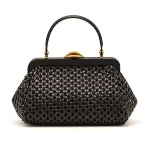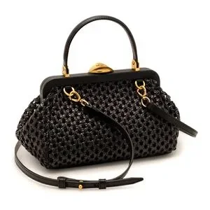 A woven convertible crossbody bag with gold toned hardware and top closure.