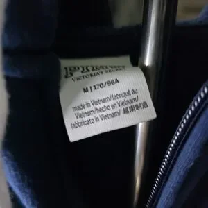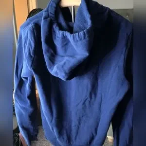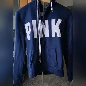 Navy zip-up hoodie featuring a large white PINK logo. Hood with white drawstrings and front pockets. Soft, casual layer for everyday wear. Simple, bold graphic style. Never wore.