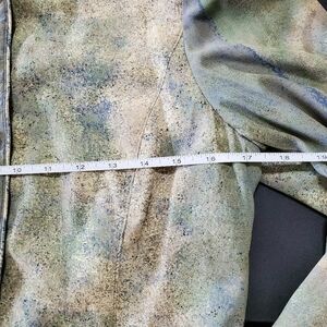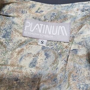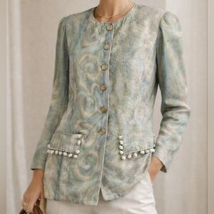Elevated vintage with an artistic edge — this Dorothy Schoelen Platinum jacket embodies effortless quiet luxury. Crafted in a soft, fluid fabric with a painterly abstract print in muted sage, blue, and cream tones, this piece feels like wearable art.