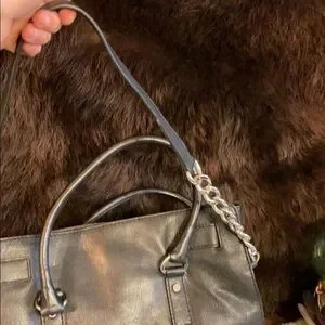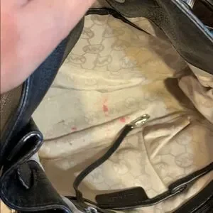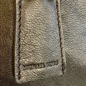 Beautiful bag by Michael Kors! It measures 13Lx13.5Hx4W. Some small pink stains inside the bag (see photos), but outside is great!!