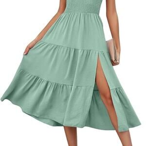 Merokeety One Shoulder Smocked Top Tiered Midi Dress with Front Slit in Sage XL