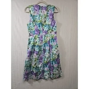 Talbots Garden Party Dress Women's 8P Floral Pleated Fit Flare Sleeveless Lined