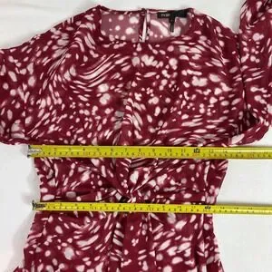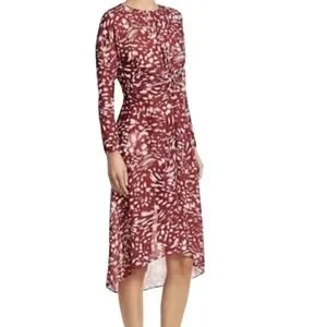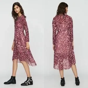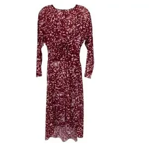 Keywords: Maje, midi dress, long sleeve dress, burgundy dress, red dress, printed dress, size 1, women's dress, cocktail dress, party dress, high low dress, boho dress, elegant dress, occasion dress