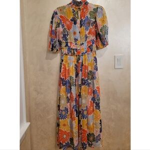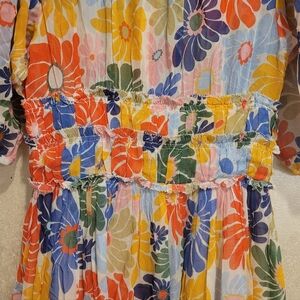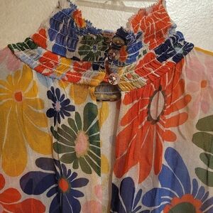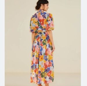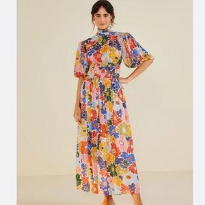 This stunning Farm Rio Sunny Daisies Sand dress is smocked at the high neck and waist creating a billowy design. Adored with a bright floral print, this style evokes a bohemian vibe.