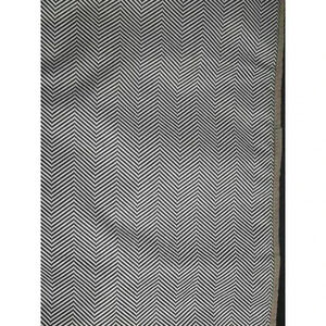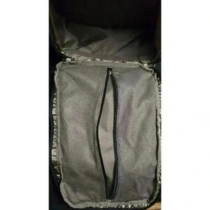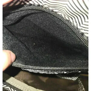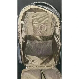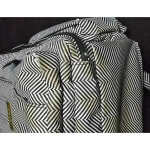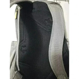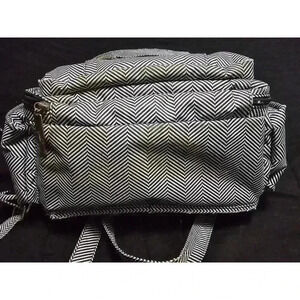 This is a Ju-Ju-Be Be Prepared diaper bag in the "Chevron" pattern. It is made of a black and white chevron patterned fabric with gold-colored hardware. The bag has a large main compartment, multiple pockets, and a changing pad. The bag is in pre-owned condition and shows signs of wear, including some staining on the bottom from being set in the ground. The bag measures approximately 16 inches tall, 14 inches wide, and 6 inches deep. The bag has adjustable straps and can be worn as a backpack or a shoulder bag. The bag is in good condition overall and is still functional and overall great condition.