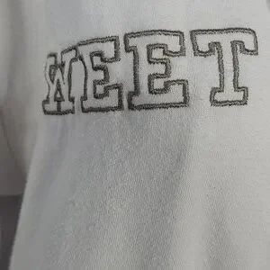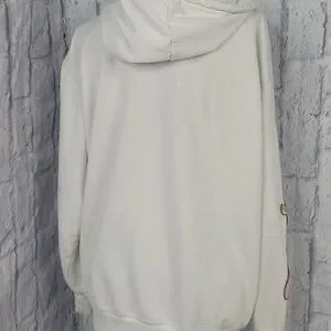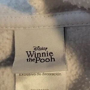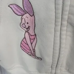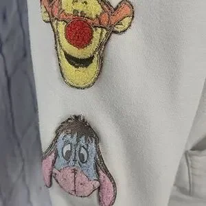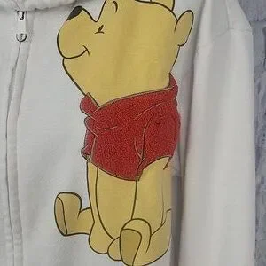 Cozy white hoodie featuring Winnie the Pooh. Includes Piglet and Tigger details. Super Cozy featuring Winnie The Pooh on the front, "Sweet" text detail, Piglet on the pocket, and varsity style "P" path on the sleeve. White fleece interior, drawstring hood, and kangaroo pockets. Perfect for Winnie The Pooh fans or anyone who wants that cute, nostalgic Disney look. 2 spots-see pictures. Approx. Measurements are Chest 42 in., Length 24 inches. Excellent Condition