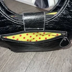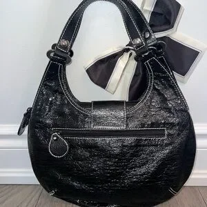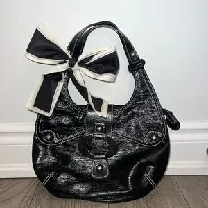 Stylish black satchel handbag with a decorative black-and-cream bow. Sleek, glossy finish and polished hardware for a modern look. Comfortable single handle for easy carrying. Versatile black color complements many outfits.