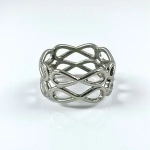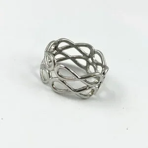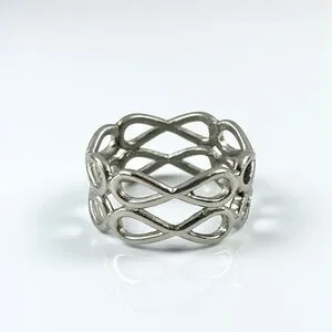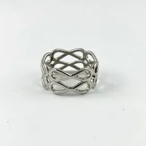 This silver band ring features a continuous infinity symbol design, forming two rows of interconnected loops. The openwork pattern creates a delicate yet substantial appearance. The ring has a polished finish and is size 8 1/4. In great condition.