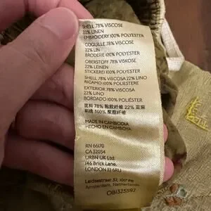 The PILCRO Anthropologie Shorts for women in size M are perfect for casual occasions with their khaki color and embroidered geometric pattern. These high-rise shorts feature a pull-on closure, elastic waist, and adjustable drawstring for comfort and a customized fit. With a 2-inch inseam and slash pockets, these shorts are designed for both style and functionality. Made from a blend of viscose and linen, they are easy to care for with machine washable instructions. Ideal for summer, fall, and spring, these shorts are a versatile addition to any wardrobe for a bohemian-themed look.