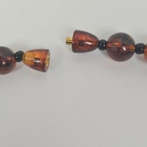 This Vintage Long 30.5" Faux Cognac Amber Necklace features a chunky beaded design made of marbled plastic in a beautiful brown orange color. The necklace is perfect for various occasions such as Mother's Day, Christmas, graduation, anniversary, birthday, and Valentine's Day. With oval, round & asymmetrical imitation amber main stone beads and black spacer beads, this retro-inspired piece exudes a bohemian and fashion-forward style, making it a unique and stylish accessory for both men and women. Barrel locking clasp.