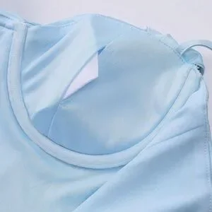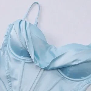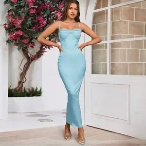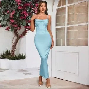 Sleek light blue spaghetti strap bodycon maxi dress with corset-style bodice. Smooth, figure-hugging silhouette for a polished evening look. Lightweight fabric offers comfortable wear and a flattering fit. Perfect for special events or nights out.