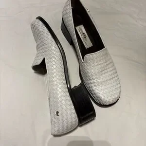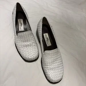 Chic white woven leather flats. Stylish and comfortable. Ideal for any occasion.