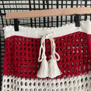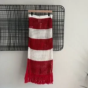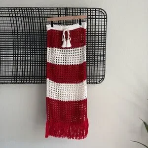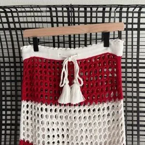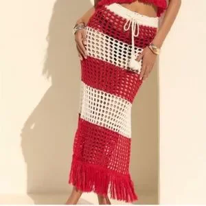 This midi skirt from FARM Rio is hand-crocheted from cotton. The skirt features striped pattern, comfortable drawstring waistband, slit hem and fringe detailing.