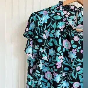 Emily Wonder 3X lightweight women's top in a black base with teal and lilac floral print. Ruffle short sleeves add a feminine touch. Soft drape and breathable fabric for everyday wear. Pairs easily with jeans or skirts for a stylish look. In like new condition and perfect for spring or summer.