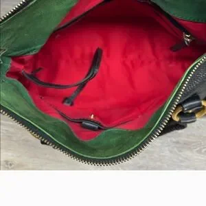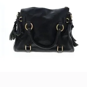Classic black leather satchel with decorative tassels and gold-tone hardware. Soft, slouchy silhouette with top handles for comfortable carrying. Secure zip closure and stylish ring accents for a polished look. Versatile black design suits day-to-night outfits.